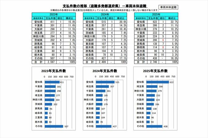 車両本体盗難の支払い件数は愛知県が2位の埼玉県と比較して約2倍の件数を占めています。
