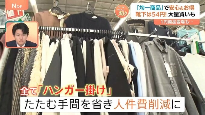 およそ2万5000点ある商品は全て「ハンガーがけ」。一つ一つたたむ手間を省くことで人件費が削減でき、安さに繋がっているといいます。ほかにも、こんなこだわりが…
