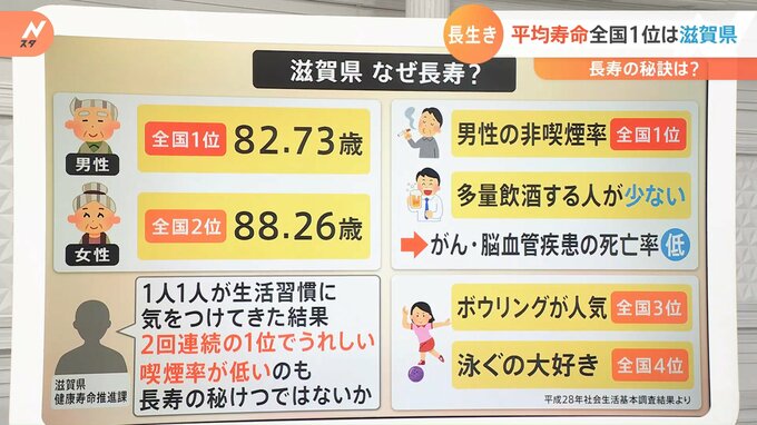 なぜ滋賀県は長寿なのでしょうか。県の健康寿命推進によりますと「1人1人が生活習慣に気をつけてきた結果、2回連続の1位でうれしい。喫煙率が低いのも長寿の秘けつではないか」とおっしゃていました。実際に滋賀県は・男性の非喫煙率全国1位・多量飲酒する人が少ないなどの条件が重なり、がん・脳血管疾患の死亡率が低くなる傾向になっています。