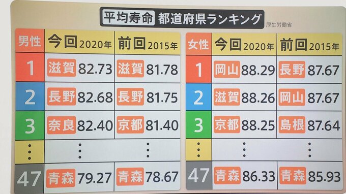 ランキングを見てみましょう。男性1位は滋賀県、女性2位も滋賀県でした。最下位は男女ともに青森県でした。