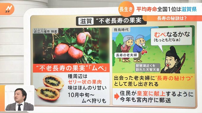 もう一つ、長寿との因果関係は不明ですが、滋賀には“不老長寿の果実”「ムベ」と呼ばれる実があります。種周辺はゼリー状の果肉で味はほんのり甘く、10月中旬からムベ狩りが行われるそうです。名前の由来は飛鳥時代、琵琶湖近くを訪れた天智天皇が長寿の老夫婦から“長寿の秘けつ”としてこの果実を差し出されたそうです。それを天皇が食べてみたところ「むべなるかな(もっともだなぁ)」と発言したことから「ムベ」と呼ぶことにしたという説があるそうです。住民の方々は皇室に献上するようになり、今年も宮内庁に郵送したそうです。