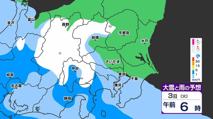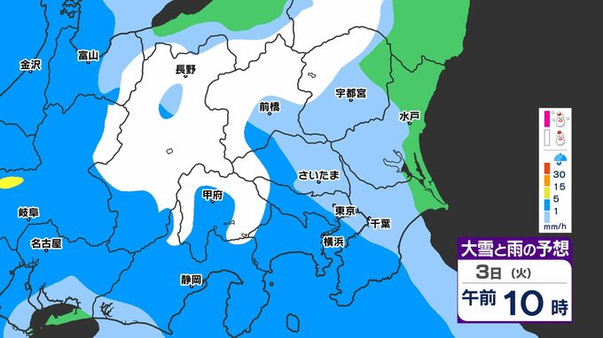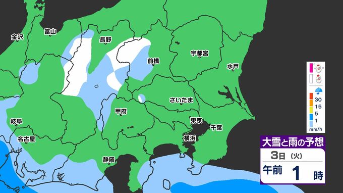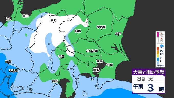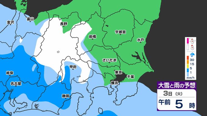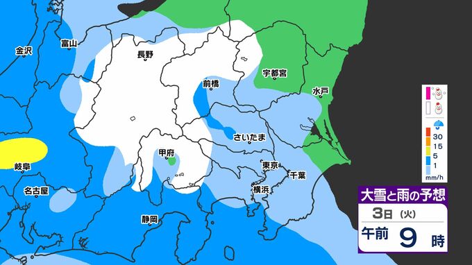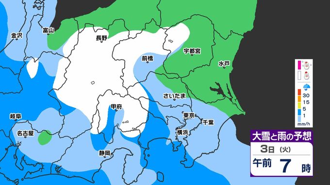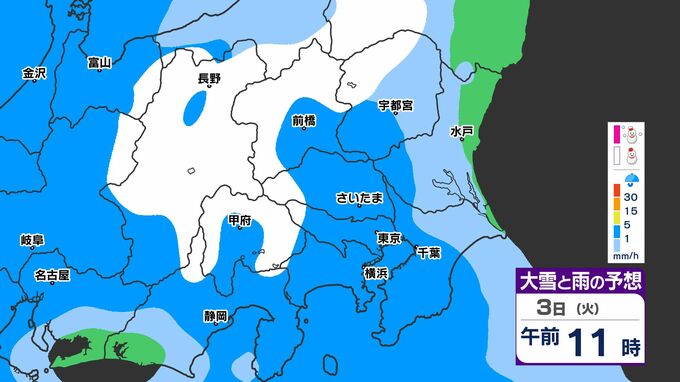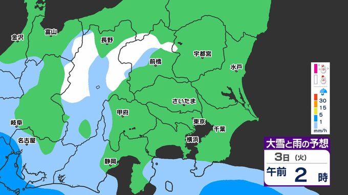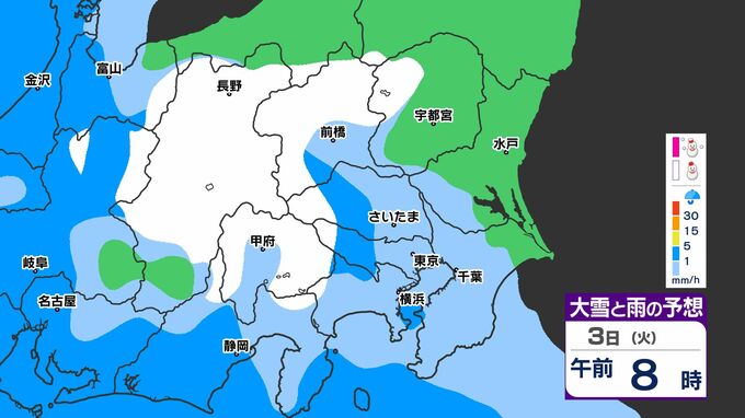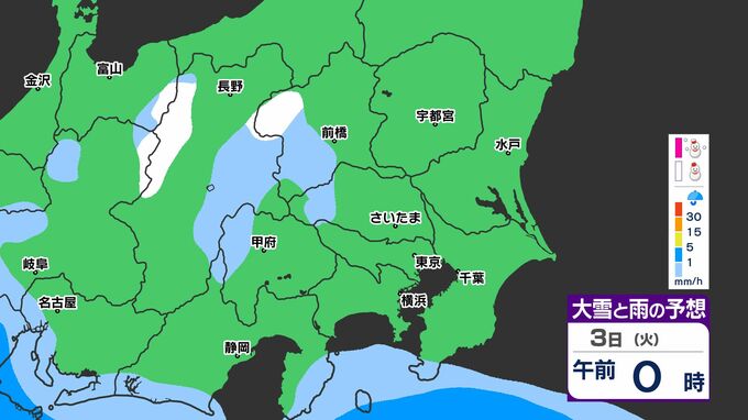 《雪と雨のシミュレーション》では、3日(火)の午前中には、関東地方の山地で「雪」が予想されていて、関東地方南部の平野部では、夜になると「雪」の予想が出てきます。