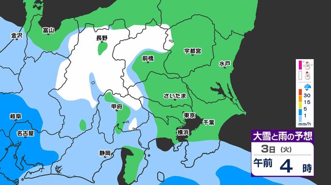 4日(水)未明から朝にかけて「雪のピーク」で、「雨」に変わってからも「本降り」でしょう。