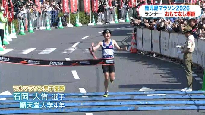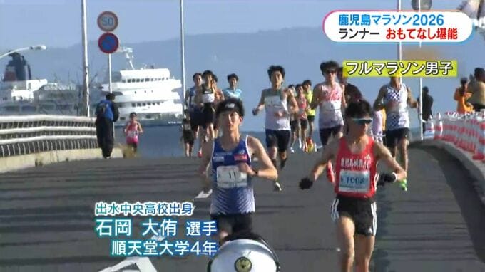 フルマラソン男子の部、先頭は出水中央高校出身で順天堂大学4年の石岡大侑選手。スタートから先頭に立ち7キロ以降独走態勢を築きます。
