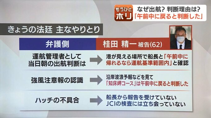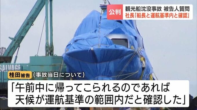 桂田被告は運航管理者として、事故当日の朝の出航判断について、「港が見える場所で船長と話し『午前中に帰って来られるのであれば、運航基準の範囲内だ』と確かめ合った」と話しました。