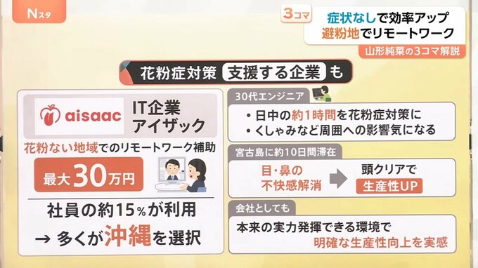 そんな中、IT企業の「アイザック」では、花粉症による生産性低下を防ぐために、花粉のない地域でのリモートワーク費用を最大30万円補助しているということです。