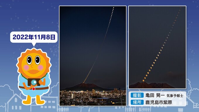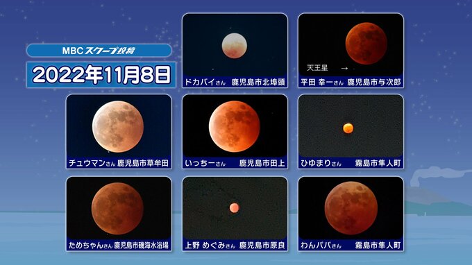 【皆既月食2026】3月3日(火)夜に起こる 「何時から 方角 見え方は?」次は3年後【観察のポイント&天気は?】 南日本放送 2026年3月2日(月) 20:00 国内 天気 【皆既月食】3月3日(火)夜 2022年11月8日の【皆既月食】の様子です。画像で掲載しています。 皆既の時は【赤銅色(しゃくどういろ)】たくさんの方に写真を送っていただきました。 【皆既月食の連続写真】桜島から昇る 様子 「撮影」亀田晃一 気象予報士