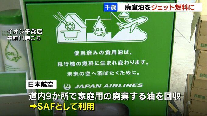 日本航空は、道内では9か所で家庭で使い終わった油を回収し、SAFに作り変えて利用しています。