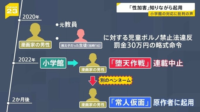 これを受け、小学館は当時、男性が描いていた漫画「堕天作戦」の連載を2022年に打ち切りましたが、その2か月後、この男性を別のペンネームで「常人仮面」の原作者に起用しました。
