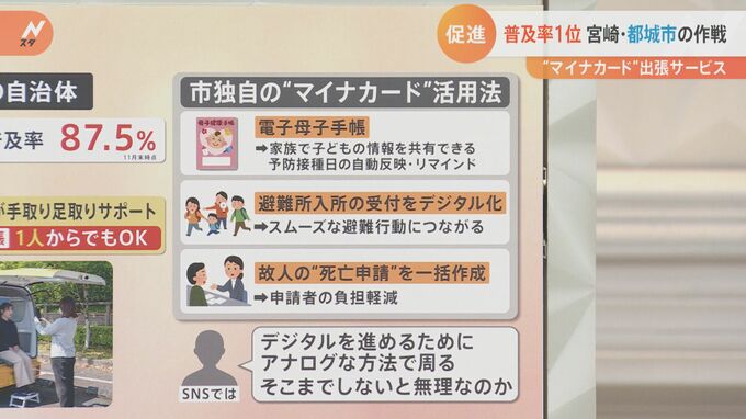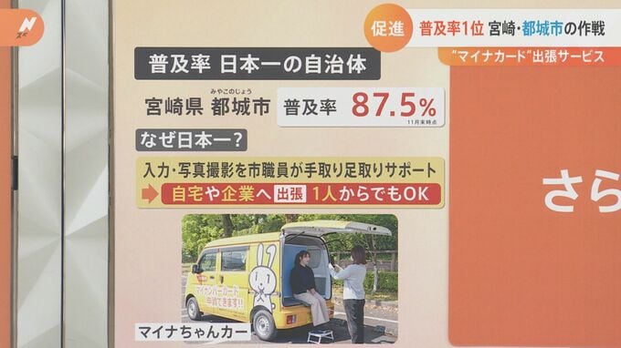 一方で、日本一の普及率の自治体についても見ていきましょう。宮崎・都城市では普及率が87.5%なんです。なぜ日本一なのか?取り組みとしてはインターネット申請などが難しい方向けに、データの入力や写真撮影を市の職員が手取り足取りサポート、「マイナちゃんカー」で自宅や企業へ出張し1人からでも利用可能なサービスを行ってくれるということなんです。この「マイナちゃんカー」は、車の後ろの部分を開けると水色の背景になっていて、ここですぐに写真撮影することができるということなんです。