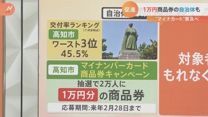 まずは、マイナンバーカード交付率ランキングワースト3位(45.5%)の高知市。「マイナンバーカード商品券キャンペーン」というものが12月22日に始まりました。抽選で2万人に1万円分の商品券が配られるということなんです。これは高知市で使えるもので、応募期間は2023年の2月28日までとなっています。