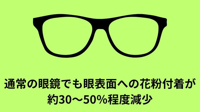 「眼鏡も侮れません。通常の眼鏡でも、眼表面への花粉付着が約30〜50%程度減少したという報告があり、花粉症用ゴーグルではさらに効果が期待できます。