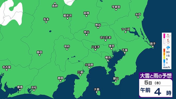 【東京23区でも積雪か】東京・神奈川・千葉・埼玉・茨城・栃木・群馬・山梨・長野 関東エリア 3日(火)~6日(金)1時間ごとの雪雨シミュレーション 東京・多摩地区は4日朝にかけて大雪のおそれ【気象庁/3日午前9時シミュレーション更新】 RSK山陽放送 2026年3月3日(火) 09:40 国内 天気 5日(木) 【画像】3日(火)~6日(金)1時間ごとの雪雨シミュレーション 【画像】3日(火)~6日(金)1時間ごとの雪雨シミュレーション