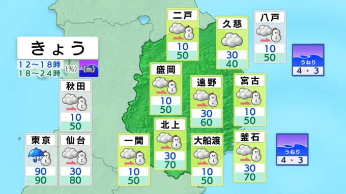 このため、岩手県の沿岸では、平地でも大雪となる所がある見込みです。また、海上では、北よりの風が雪を伴って強く吹き、うねりを伴い、しけるでしょう。気温が予想よりも低く経過した場合は、警報級の大雪となる可能性があり、低気圧の発達程度や進路によっては、警報級の北よりの風や高波となる可能性があります。