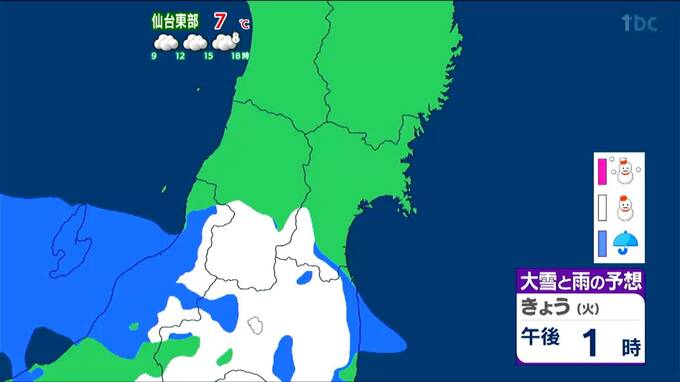 この雪雲が次第に北上していく見込みです。沿岸の地域は雨で降るところもありますが、ほとんどのところでその雨が湿った雪に変わる予想です。