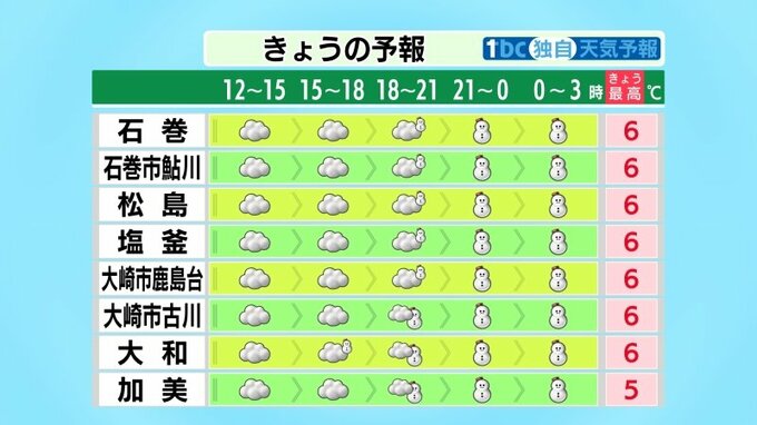 ■塩釜:6℃ ■大崎市鹿島台:6℃ ■大崎市古川:6℃