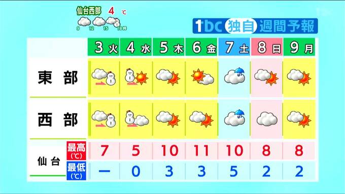 この雪ですが、4日の昼頃まで降るところが多い予想です。雪は今夜だけでは終わらず、4日は警報級の大雪などになる可能性があります。午後は次第に止んで晴れや曇りとなるでしょう。木曜、金曜も晴れ間が出ますが、土曜は広い範囲で雨が降りそうです。