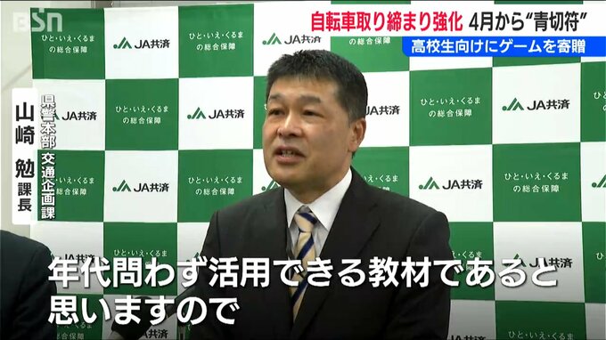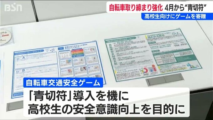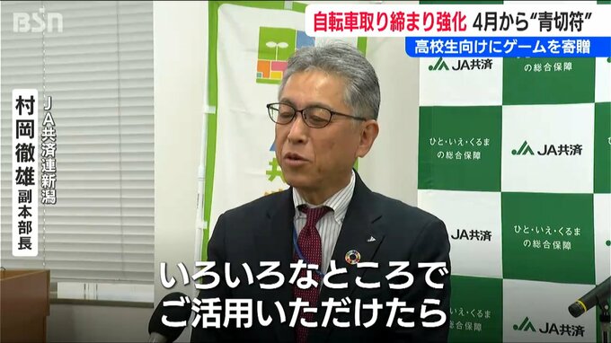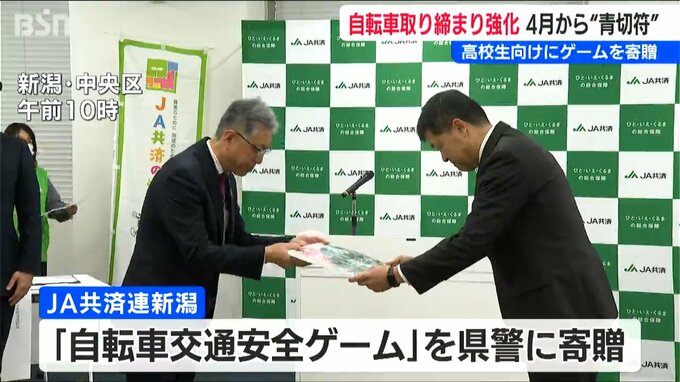 自転車利用者への取り締まりを強化するいわゆる「青切符」が導入されるのを前に、高校生向けのユニークな教材が、JA共済連新潟から警察に贈られました。