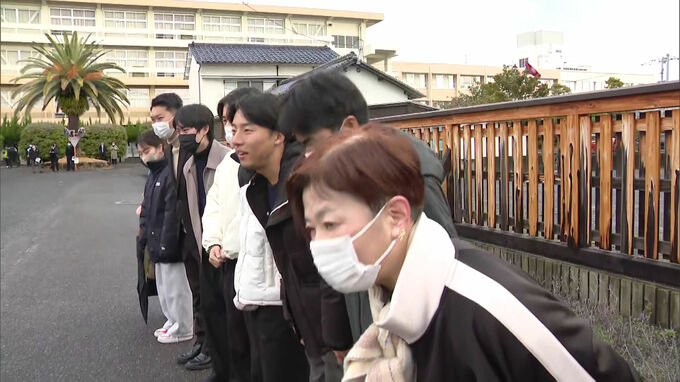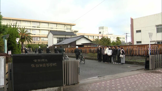 佐賀市城内の佐賀西高校では、受験生たちが塾の講師たちに見送られながら試験会場に入っていきました。