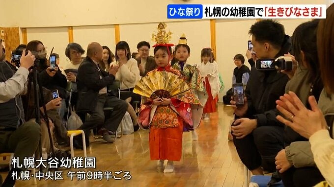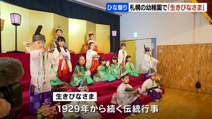 年長の園児たちがひな人形に扮するこの「生きびなさま」は、札幌市中央区の札幌大谷幼稚園で1929年から毎年続く伝統行事です。
