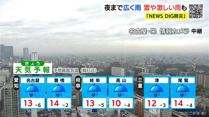 正午前の名古屋市内は、厚い雲に覆われていて、きのうの夜から雨が続いています。気温は13.6℃で、風は強くありません。