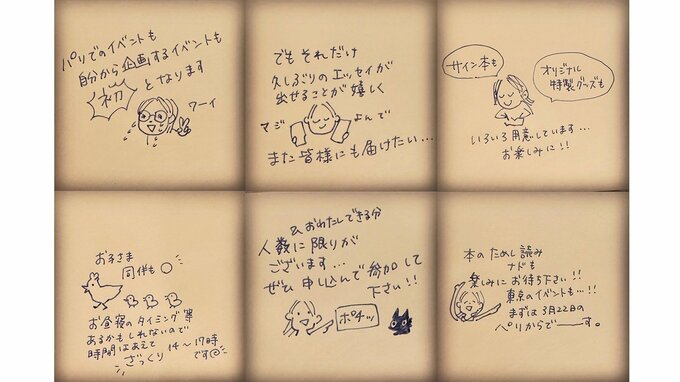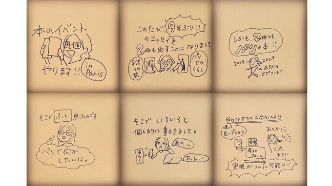 俳優の杏さんが自身のインスタグラムを更新。温かみのある自筆の漫画イラストを添えて、パリで初のファンミーティングを開催することを発表しました。9年ぶりとなるエッセイ2冊の出版を記念したイベントで、3月22日に現地で行われます。