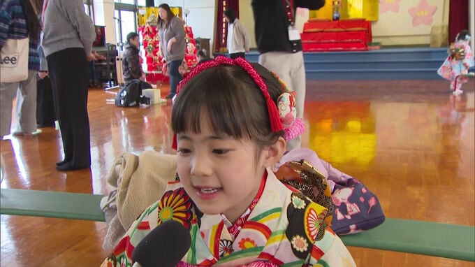 福岡市博多区の玉水幼稚園では3日女の子は振り袖を着て男の子は袴をはきました。
