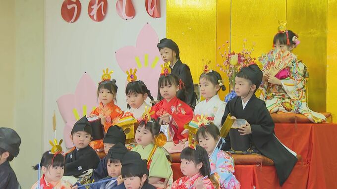 福岡市博多区の幼稚園では、園児たちがひな人形に扮してひな壇に上がりました。