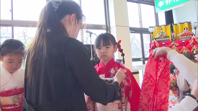 「きょうはひな祭りです、子どもたちがお雛様になるため着付けを行っています」