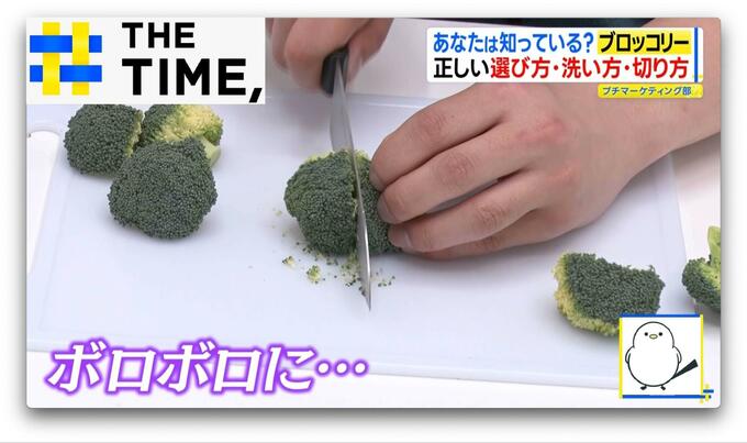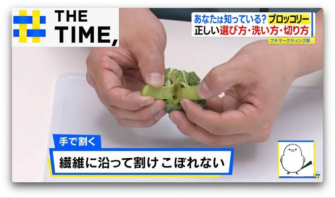 包丁で切った場合、ブロッコリーの繊維を分断してしまうのですが、手で割くことで繊維に沿って割けボロボロとこぼれることがないとのこと。