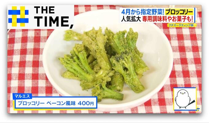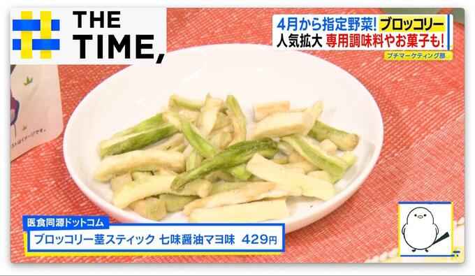 さらには、スナック感覚の「ブロッコリー ベーコン風味」(マルエス/27g・400円)や、真空フライ製法で軽い食感に仕上げた「ブロッコリー茎スティック 七味醤油マヨ味)」(医食同源ドットコム/45g・429円)などのお菓子も登場。