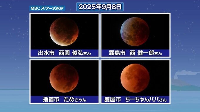 「皆既月食」中の月は真っ暗になって見えなくなるわけではなく、「赤銅(しゃくどう)色」と呼ばれる赤黒い色に見えます。MBCのスクープ投稿に頂いた、2025年9月8日、2022年11月8日の皆既月食中の写真で「赤銅(しゃくどう)色」を確認してみてください。