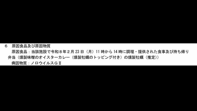 県によりますと、食中毒の原因は、2月23日午前11時~午後2時にかけて調理・提供された食事および持ち帰り弁当に入っていた「燻製味噌のオイスターカレー(燻製牡蠣のトッピング付き)」の「燻製牡蠣」だと推定されるということです。