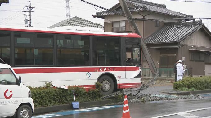 愛知県春日井市で、名鉄バスが電柱に衝突する事故がありました。電柱の根元が大破し傾いています。
