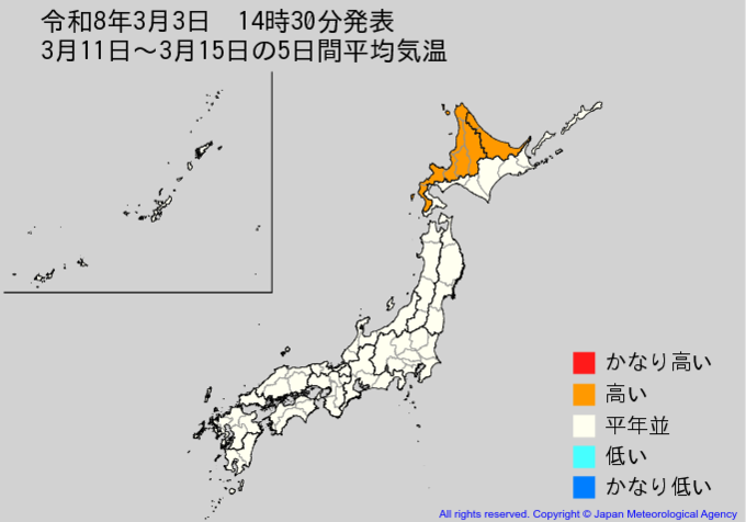 【2週間気温予報】東北地方と東日本の気温は向こう4日間程度は高い日が多い予報 その後は平年並か低い予報 全国の天気を地方ごとに 気象庁 テレビユー山形 2026年3月3日(火) 15:14 国内 ■3月11日~3月15日の5日間平均気温(画像) ・8日先から12日先まで5日間平均した日平均気温を表示しています。 ・かなり高い(かなり低い)は、かなり高い(かなり低い)気温となる確率が30%以上のときに表示します。