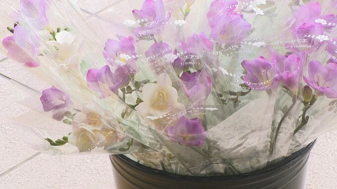 IRいしかわ鉄道の東金沢駅で卒業生に手渡されたのは、石川県産フリージアのオリジナル品種「エアリーフローラ」です。