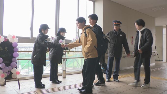 IRいしかわ鉄道が電車を利用する卒業生たちに、石川県が開発したフリージアの一種「エアリーフローラ」を贈りました。