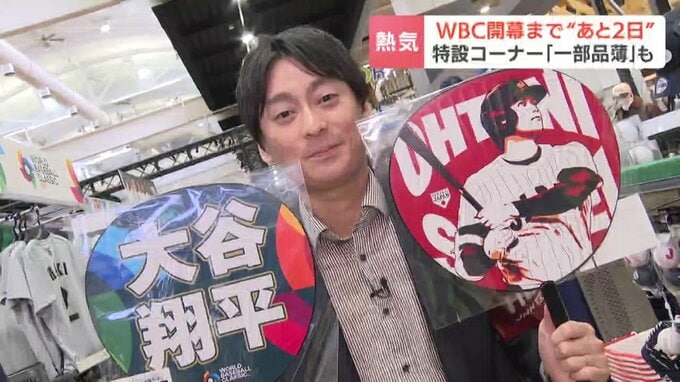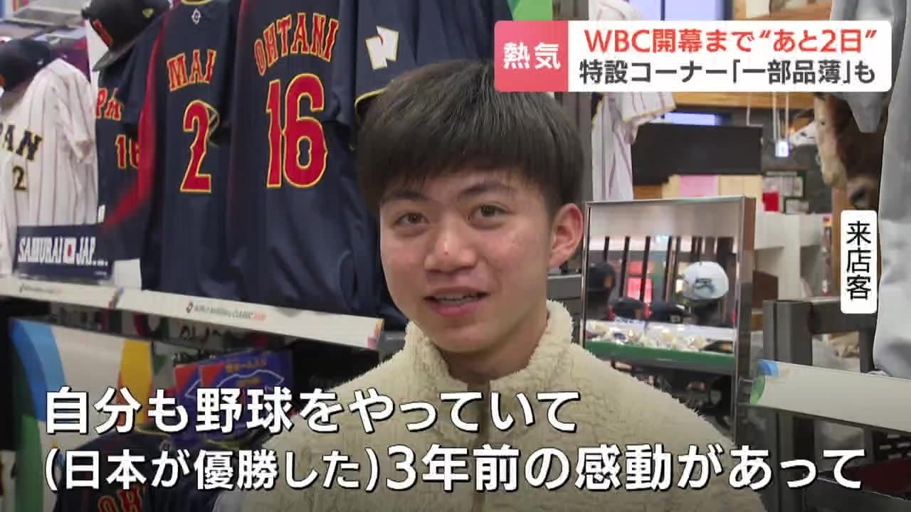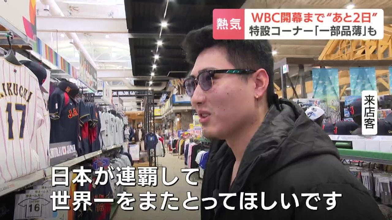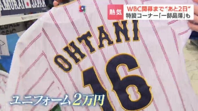 「こちらのお店では特設コーナーを用意。ずらっと並んでいるのは、侍ジャパンのユニフォーム。関連グッズも豊富に揃えられ、早くも盛り上がりを見せています」
