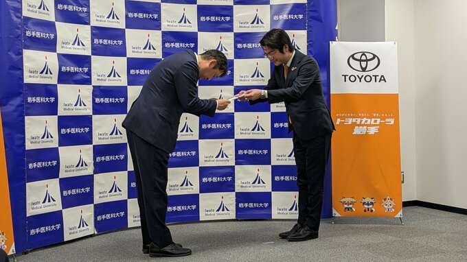 3日の贈呈式では、トヨタカローラ岩手の塚原孝一社長から岩手医科大学附属病院の森野禎浩病院長に現金100万円の目録が手渡されました。