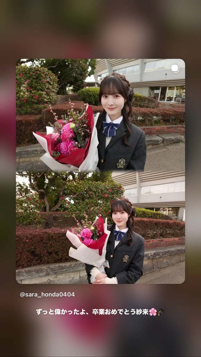 そして真凜さんは、紗来さんが制服姿で花束を抱える写真をストーリーズに投稿。紗来さんに宛てて「ずっと偉かったよ、卒業おめでとう紗来」と、紗来さんのがんばりをそばで見てきた真凜さんの言葉が添えられています。