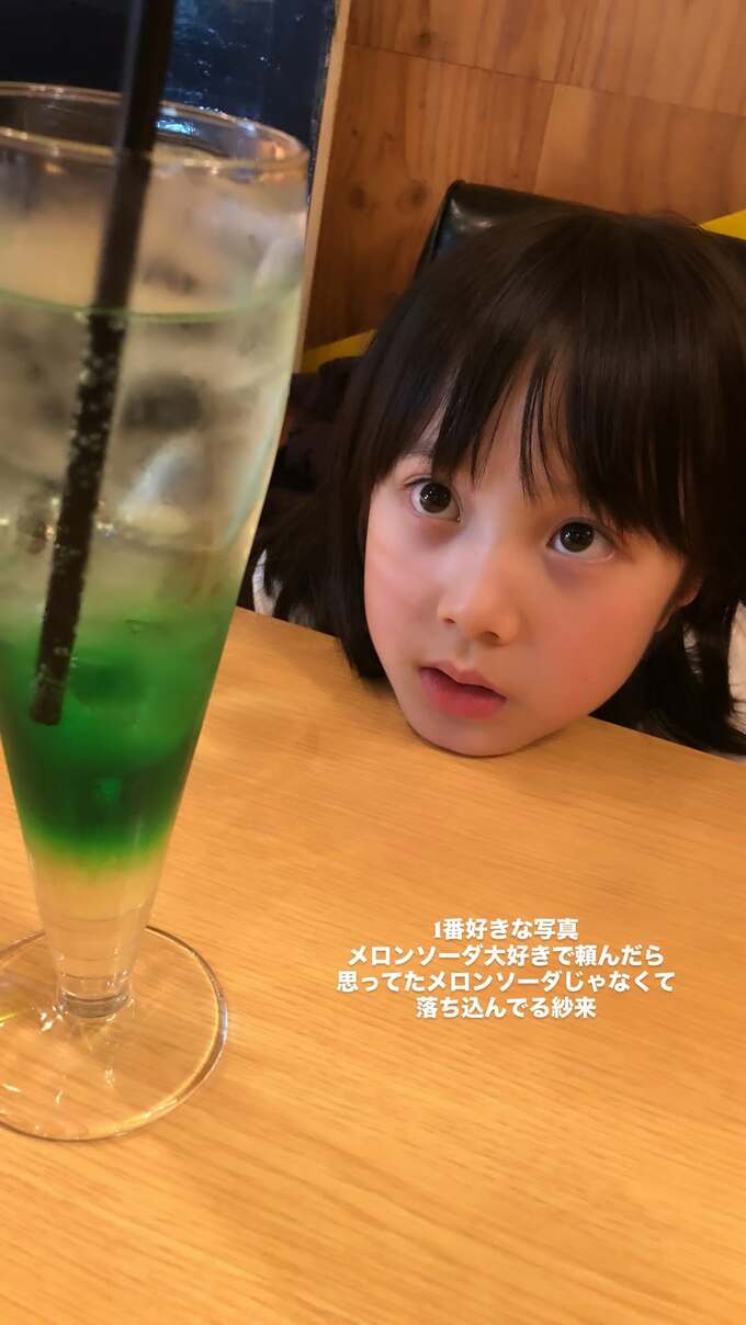 さらに真凜さんが「1番好きな写真」として投稿したのは、ソーダのグラスを前にして、テーブルに顔をくっつけて上目遣いにグラスを見上げる紗来さん。紗来さんの表情は茫然としていて「メロンソーダ大好きで頼んだら」「思ってたメロンソーダじゃなくて落ち込んでる紗来」とのこと。微笑ましい思い出の一コマとなっています。