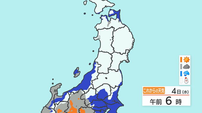 東北太平洋側では、3日夜遅くから5日にかけて、大雪による交通障害、屋根からの落雪、建物や農業施設への被害に注意・警戒し、湿った雪による電線や樹木への着雪、なだれに注意してください。また、4日明け方から5日にかけて、雪を伴った北よりの強い風による交通障害や建物への被害に、4日朝から5日にかけて、高波による船舶や沿岸施設への被害に注意・警戒してください。