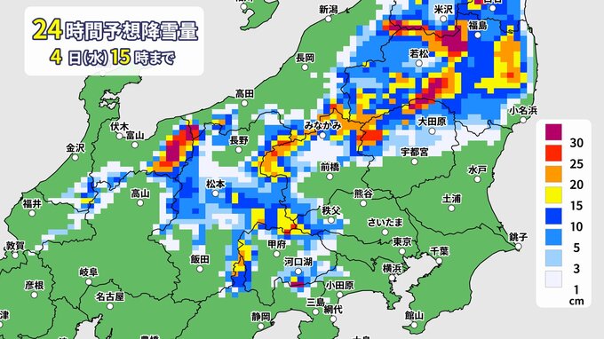 4日15時までに予想される降雪量は、関東甲信地方の山地や山沿いでは10センチから30センチ程度となっています。