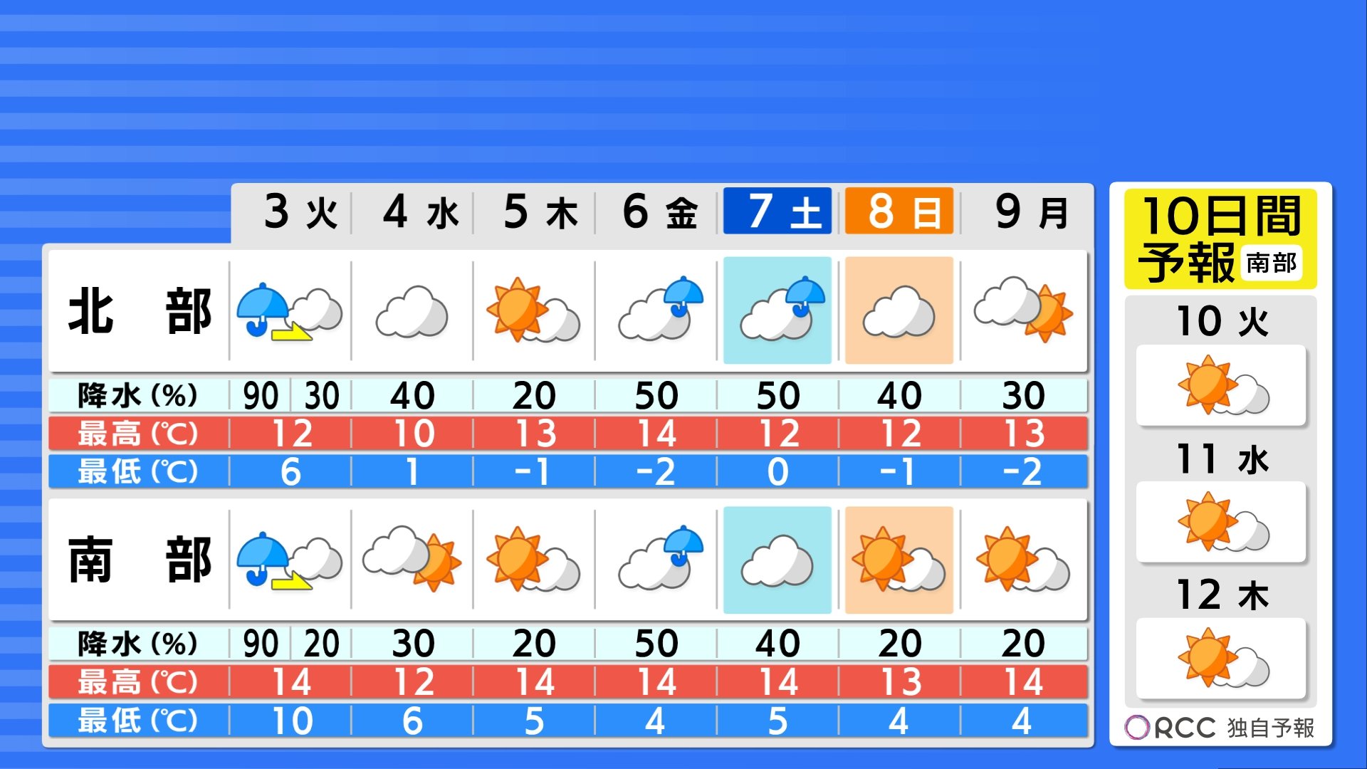 今週も周期的な天気変化になるでしょう。木曜日はおおむね晴れますが、金曜日は再び下り坂で午後から土曜日の朝にかけて雨が降る見込みです。寒気が流れ込むため北部では雪になる可能性があります。雨上がりは花粉の飛散量が増加するため対策をしっかりしてください。