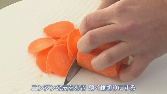 【1】にんじんは皮を剥いて薄い輪切りにする。耐熱ボウルに入れてラップをかけ、600wの電子レンジで1分加熱する。