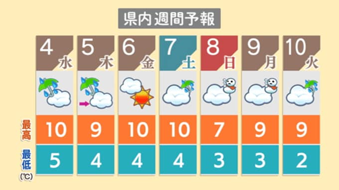 今後一週間の新潟県内は、気温は平年よりも少し高いものの、雨の日が続き、体感よりも肌寒く感じられそうですので、寒暖差による体調管理に気を付けましょう。