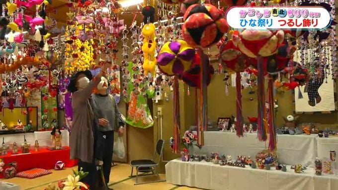 大小3つのひな壇と天井からつるされた、色とりどりのつるし飾り。薩摩川内市で開かれた「ひな祭りスタンプラリー」の一コマです。