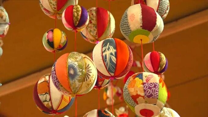地域の人たちが手作りした飾りは、金魚や鶴、手まりなどさまざま。要らなくなった着物を利用して作りました。