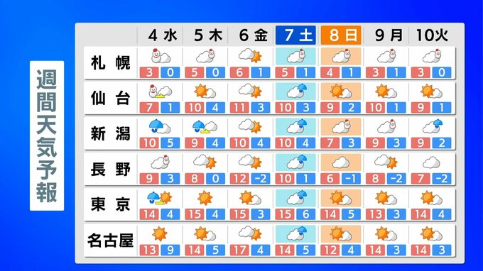 仙台 : 7℃ 新潟:10℃