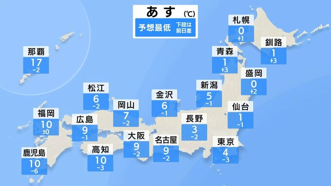きょうと同じくらいの所が多いですが、東京など関東はきょうより暖かくなるでしょう。